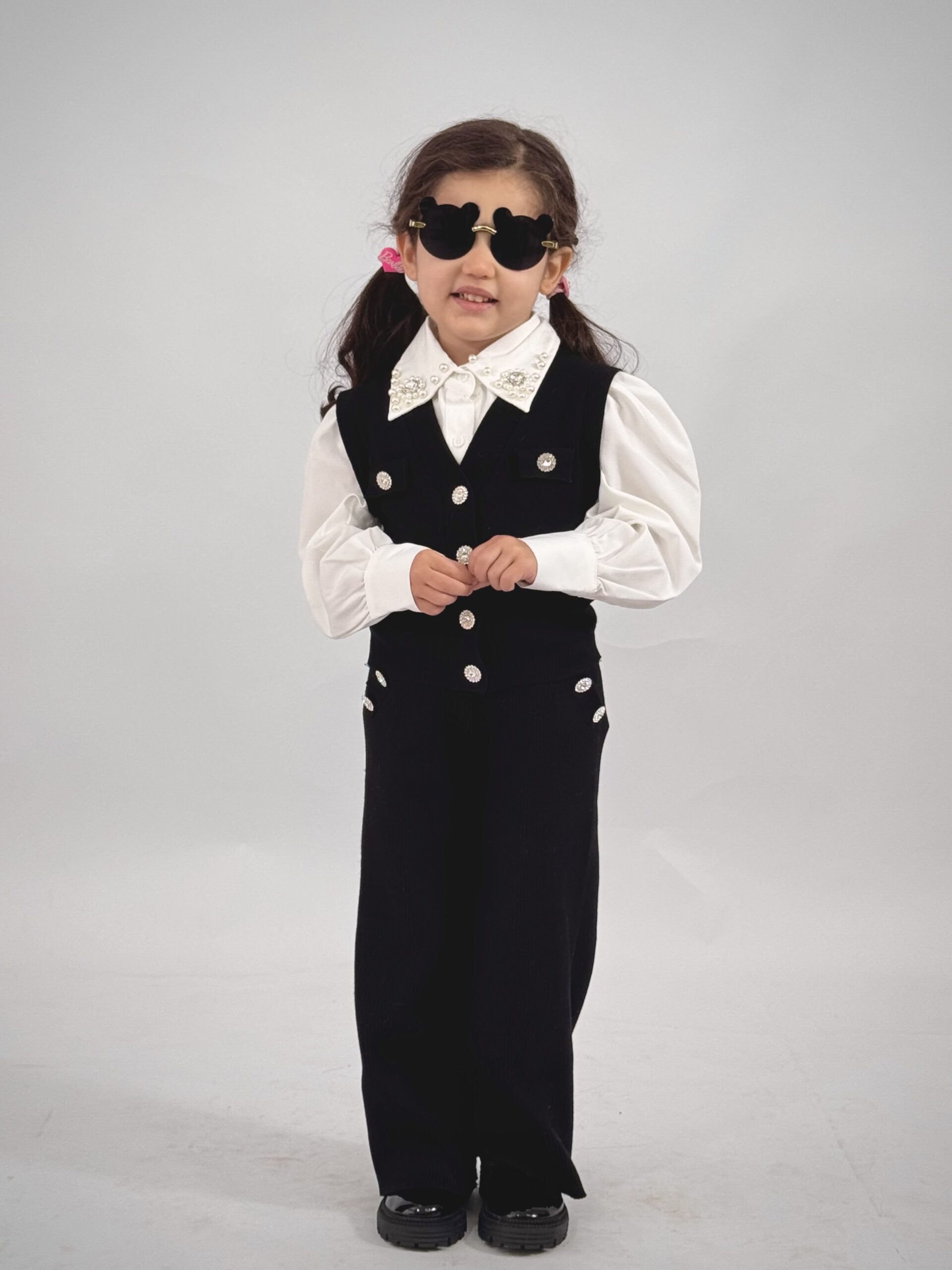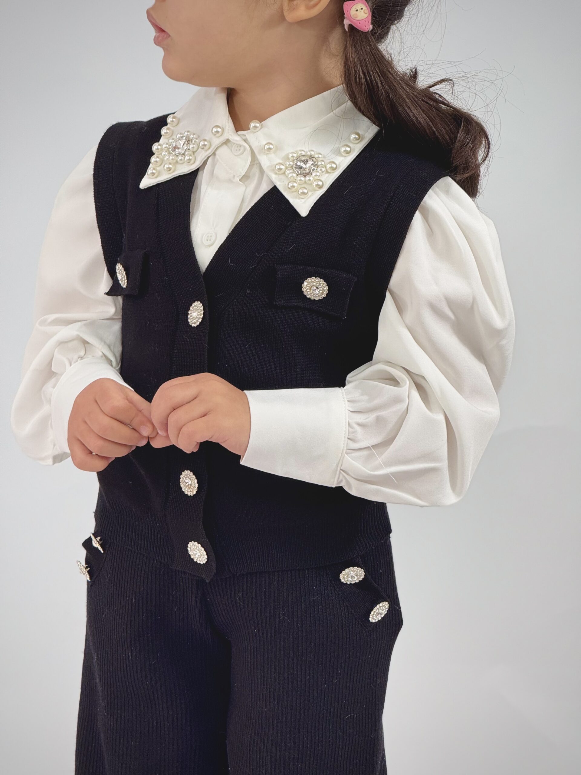 nsemble fille élégant composé d’une chemise blanche avec col décoré et d’une Ensemble noire avec boutons brillants.